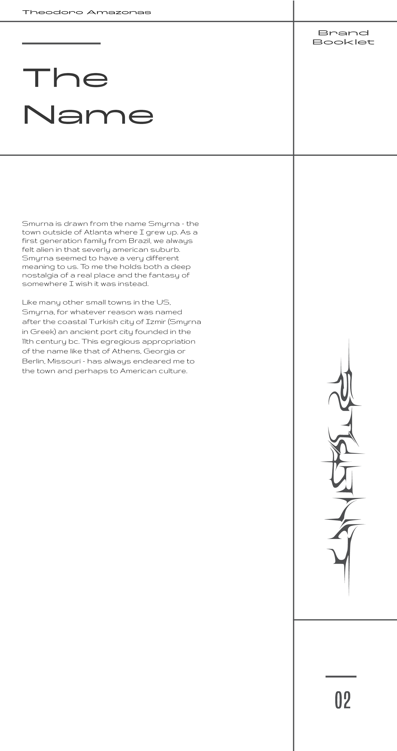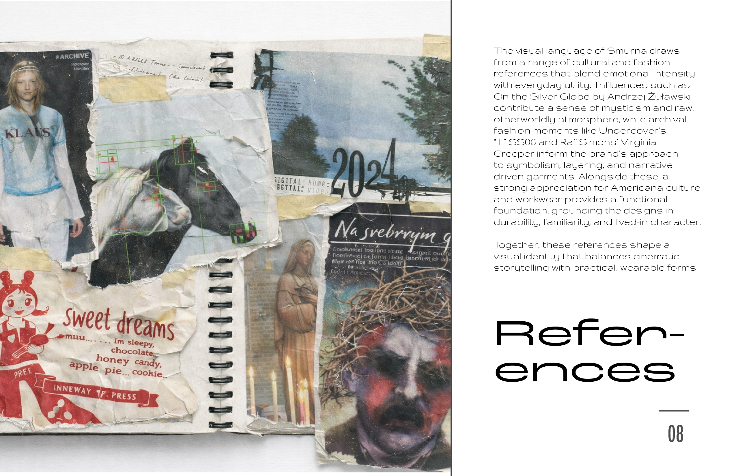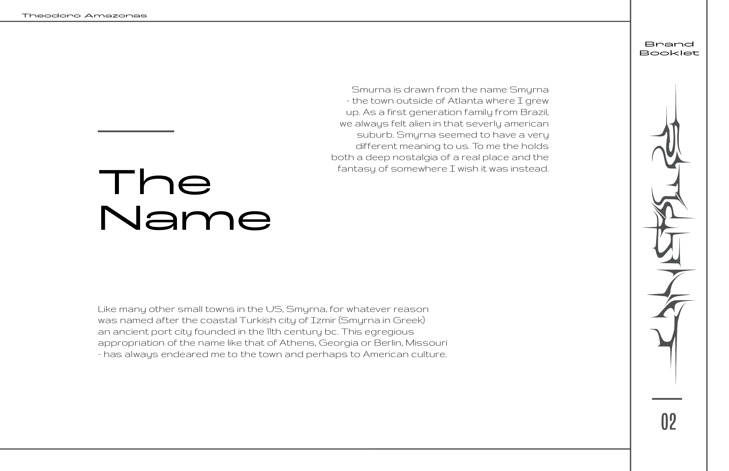 Smurna is a visual identity project rooted in memory, displacement, and the aesthetics of workwear and Americana. Drawing from personal history, science-fiction visual language, and archival references, the brand system balances restraint with distortion—clean grids disrupted by expressive typography, texture, and wear. The result is an identity that feels both institutional and intimate, designed to evolve fluidly across garments, print, and digital environments.