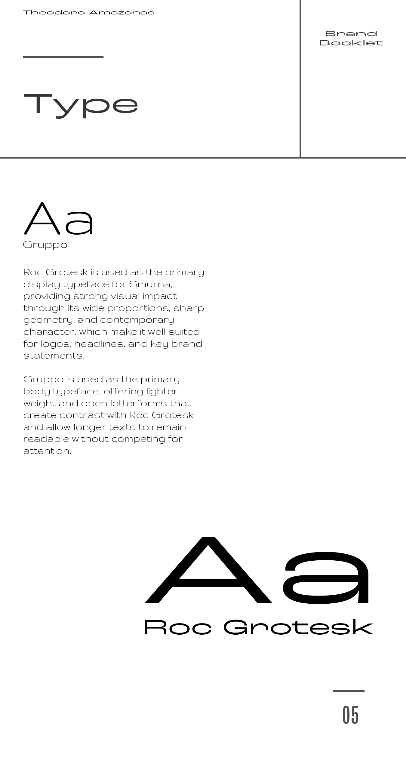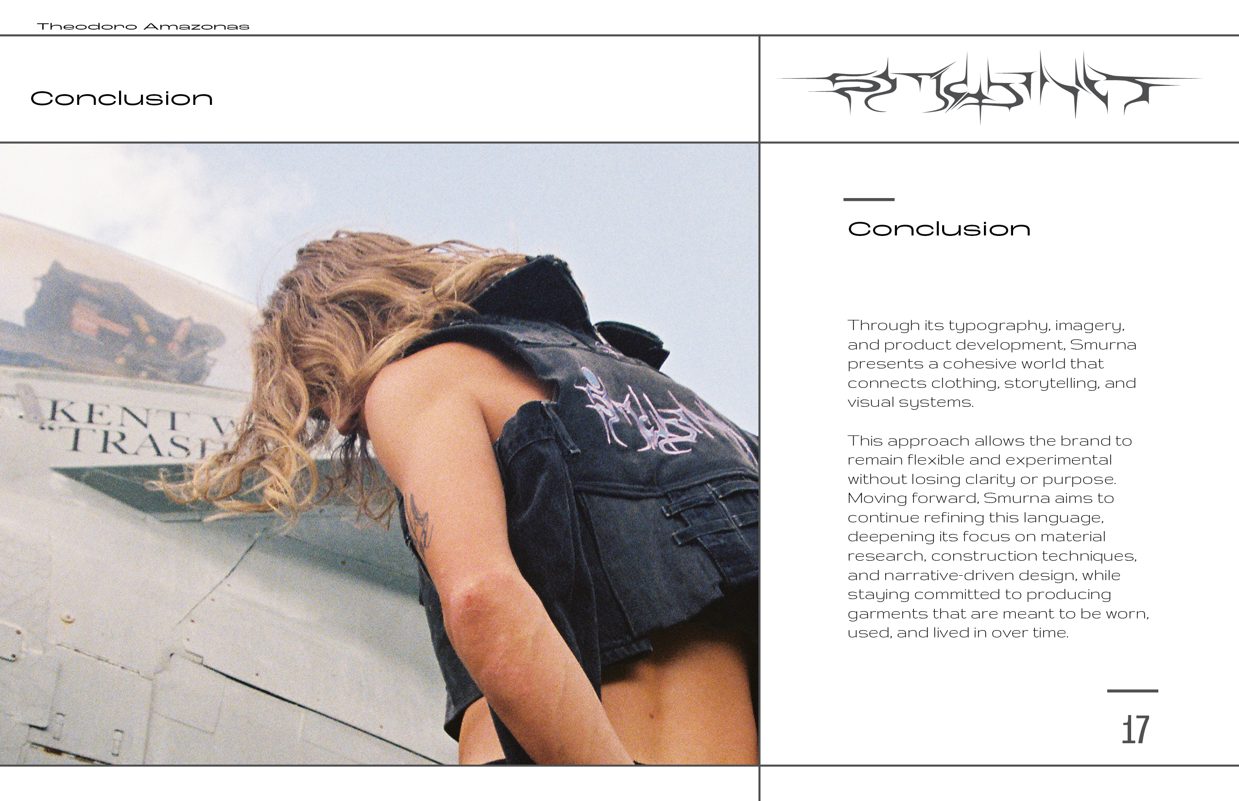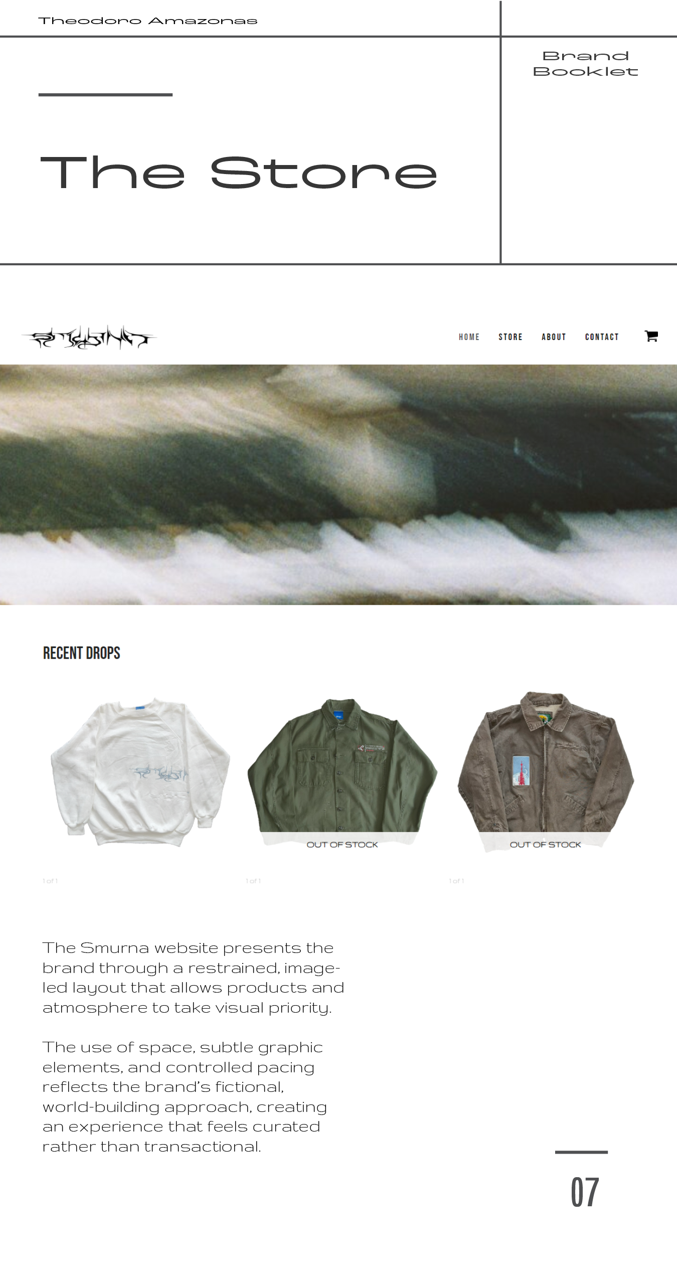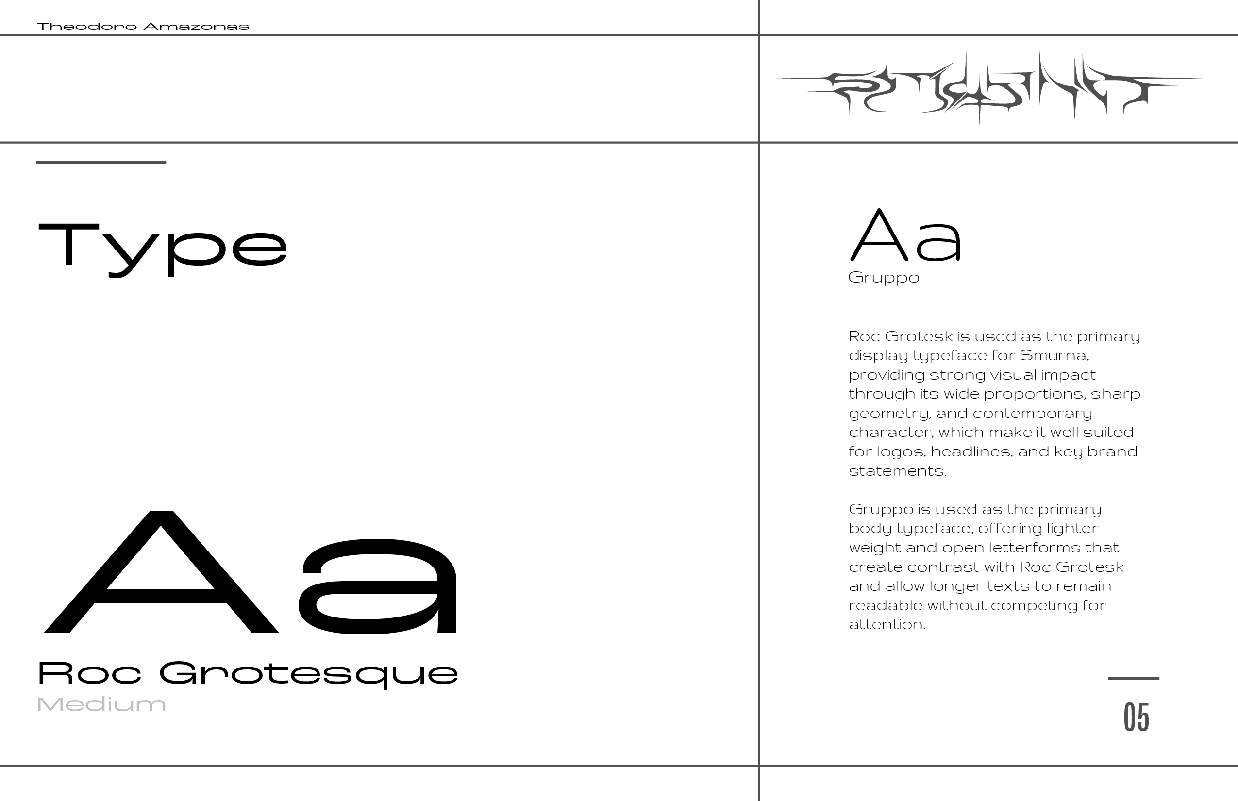 Smurna is a visual identity project rooted in memory, displacement, and the aesthetics of workwear and Americana. Drawing from personal history, science-fiction visual language, and archival references, the brand system balances restraint with distortion—clean grids disrupted by expressive typography, texture, and wear. The result is an identity that feels both institutional and intimate, designed to evolve fluidly across garments, print, and digital environments.