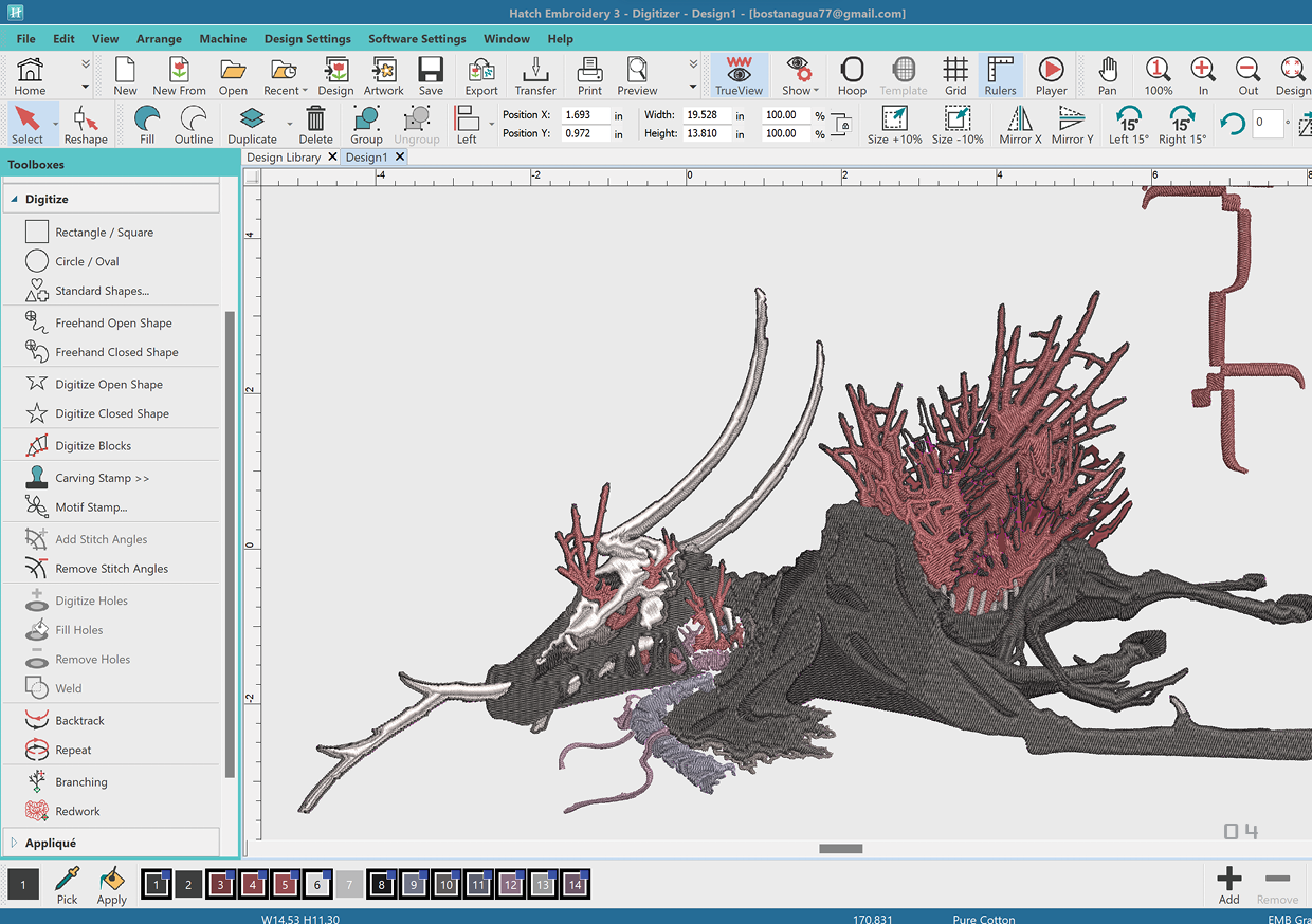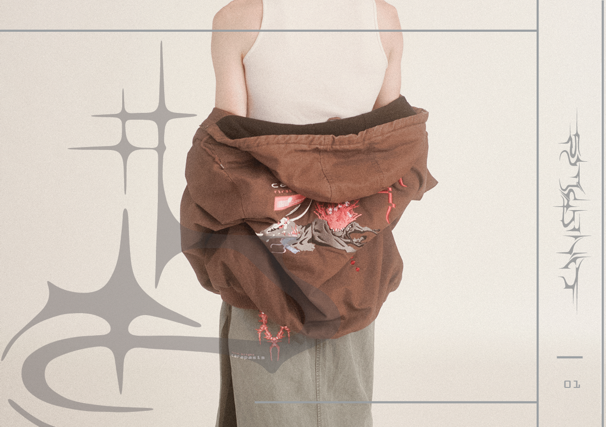 These slides document how Smurna develops visualizations for embroidery artwork on garments, showing the evolution from initial sketches to finalized stitch-ready files. The process begins with conceptual illustration and moves through layered digital refinement and technical digitizing for embroidery software. By working visually at each stage, Smurna treats embroidery as a design medium in its own right, where form, texture, and color are all considered in relation to the garment. The final slides show how these visualizations translate into actual embroidered garments, emphasizing how technical constraints inform the aesthetic outcome.